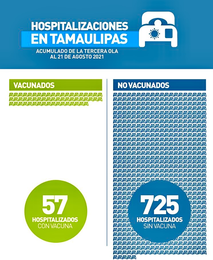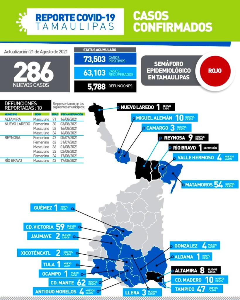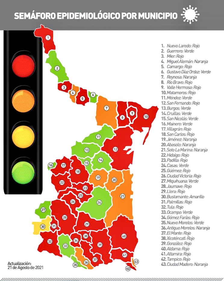 Al día de hoy, hay 4,612 casos activos en Tamaulipas y ante el incremento acelerado de casos de COVID19, el aumento paulatino de la ocupación hospitalaria y el número de defunciones registrado en los últimos días, el estado pasará a semáforo de riesgo epidemiológico federal rojo (riesgo máximo) del 23 de agosto al 5 de septiembre, asociado a la tercera ola de la pandemia.