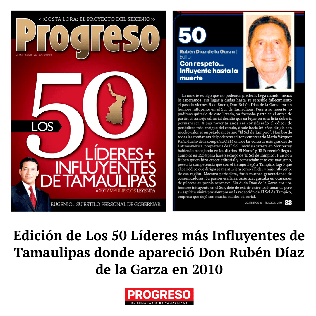 En 22 de enero del 2010 se publicó nuestro primer listado de los 50 Líderes más Influyentes de Tamaulipas y pese a que el influyente director del El Sol de Tampico, Rubén Díaz de la Garza había fallecido 16 días antes, el Consejo Editorial de la Revista Progreso decidió dejar en el listado a un hombre que por 56 años influyó en la vida pública del Sur de Tamaulipas. Este año El Sol de Tampico cumple 70 años de un periodismo veraz, profesional y al servicio del pueblo. No se puede hablar de este periódico sin recordar a Don Rubén… esto fue lo que publicamos de él en año 2010: