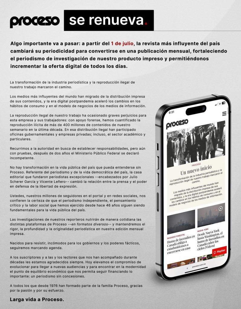 “Algo importante va a pasar en Proceso. A partir del 1 de julio, migramos el legado de nuestros fundadores a la era digital: la revista más influyente del país fortalecerá la oferta digital diaria -en todas sus plataformas- y transformará el semanario en ediciones mensuales de colección con los mejores reportajes de investigación. Larga vida a Proceso”, indicó.