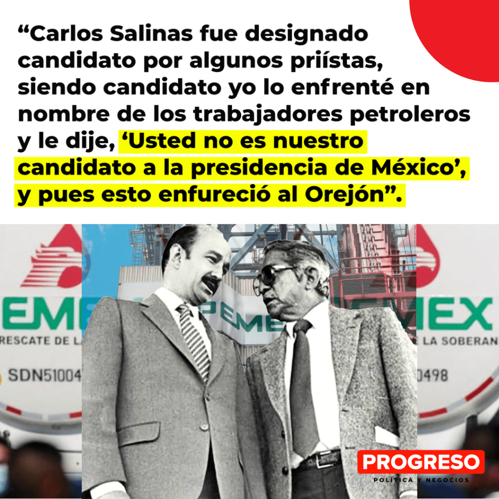 A la pregunta de ¿Por qué fue arrestado ‘La Quina’ y no otro líder sindical? mencionó: “Carlos Salinas fue designado candidato por algunos priístas, siendo candidato yo lo enfrenté en nombre de lostrabajadores petroleros y le dije, ‘Usted no es nuestro candidato a la presidencia de México’, y pues esto enfureció al Orejón”.