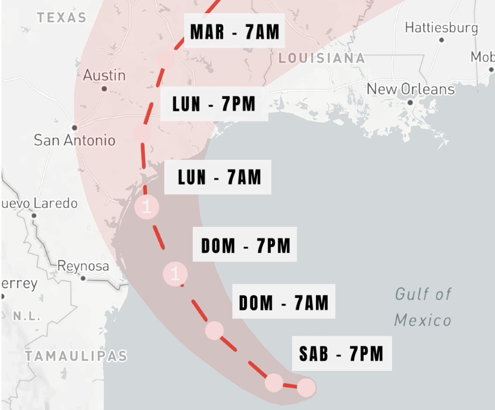 El Servicio Meteorológico Nacional (SMN), de la Comisión Nacional del Agua (Conagua), en coordinación con el Centro Nacional de Huracanes, de Estados Unidos de América, establecen zona de prevención por efectos de tormenta tropical desde Barra el Mezquital, Tamaulipas, hasta la desembocadura de río Grande, en la frontera México-Estados Unidos de América.