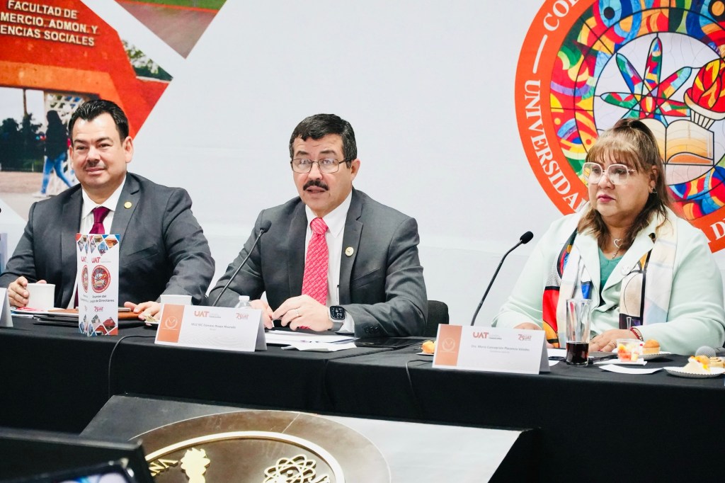 El rector Dámaso Anaya Alvarado presidió la onceava Reunión del Colegio de Directores de la Universidad Autónoma de Tamaulipas (UAT), donde se presentó el proyecto que busca ampliar la cobertura educativa mediante la oferta de carreras y programas de bachillerato en la modalidad virtual.