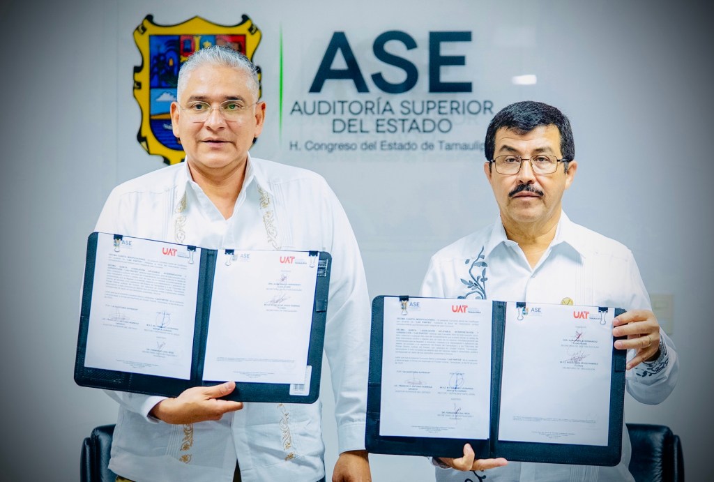 El rector de la Universidad Autónoma de Tamaulipas (UAT), Dámaso Anaya Alvarado, y el titular de la Auditoría Superior del Estado de Tamaulipas (ASE), Francisco Antonio Noriega Orozco, presidieron la firma del convenio marco de colaboración con el propósito de establecer una alianza estratégica que fortalezca la cooperación académica, técnica y profesional.