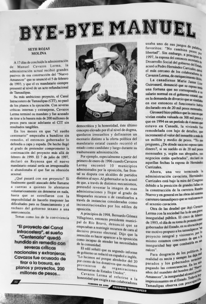 Cavazos Lerma al referirse a la honestidad que exigía a sus colaboradores usaba uno de sus juegos de palabras favoritos: “No cambien pesos por libertad”. Sin embargo, a principios de 1997, la esposa del entonces secretario de Desarrollo Social del gobierno del Estado acusó a Pedro Hernández Carrizales, quiza el más cercano de los colaboradores de Cavazos Lerma, de enriquecimiento ilícito.