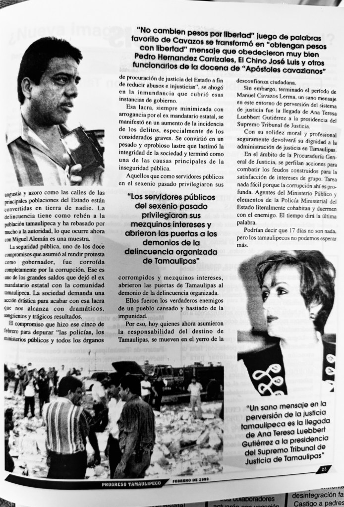 Sin embargo, terminado el período de Manuel Cavazos Lerma, un sano mensaje en este entorno de perversión del sistema de justicia fue la llegada de Ana Teresa Luebbert Gutiérrez a la presidencia del Supremo Tribunal de Justicia. Con su solidez moral y profesional seguramente devolverá su dignidad a la administración de justicia en Tamaulipas.